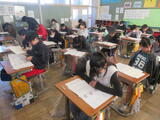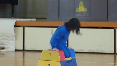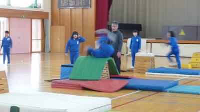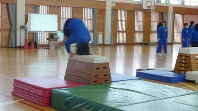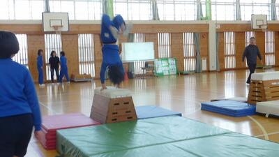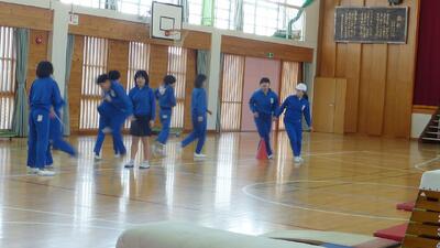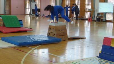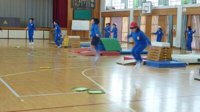 授業風景(6年生 体育) 投稿: 承認者 (15:26) 体育館で、体育専科の先生による6年生の授業が行われていました。はじめに、短縄で個人の記録に挑戦です。次に大縄跳びです。縄を跳んだ後、赤いコーンまで走る8の字跳びは体力がつきそうです。5分間の8の字跳びでは、後半になると集中力と団結力がアップしてきてスピード感がありました。次に跳び箱の技に挑戦です。開脚跳び、台上前転、閉脚跳びなどに取り組める場の設定があるので、それぞれが積極的に技に挑んでいました。 Tweet -